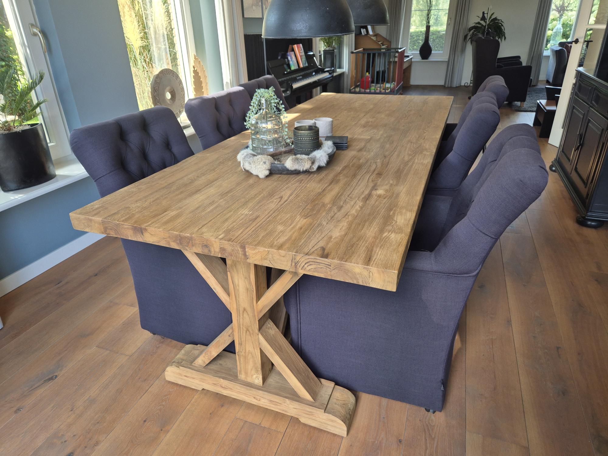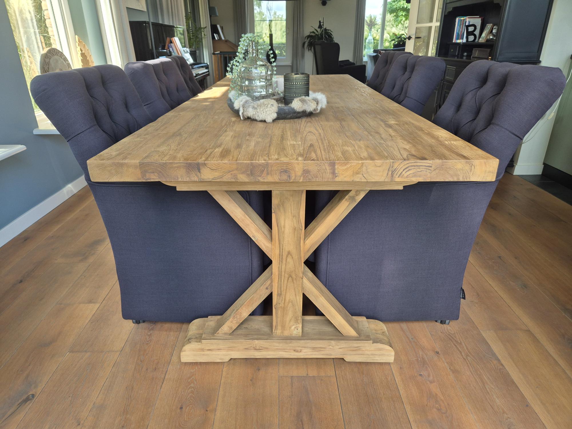 Deze teakhouten eettafel met houten kruispoot is een stijlvolle en robuuste blikvanger voor iedere eetkamer. Met zijn royale afmeting van 250 × 100 cm biedt de tafel volop ruimte voor lange diners en gezellige momenten. Het tafelblad is vervaardigd uit massief oud teakhout en heeft een dikte van 5 cm, wat zorgt voor een krachtige en duurzame uitstraling.